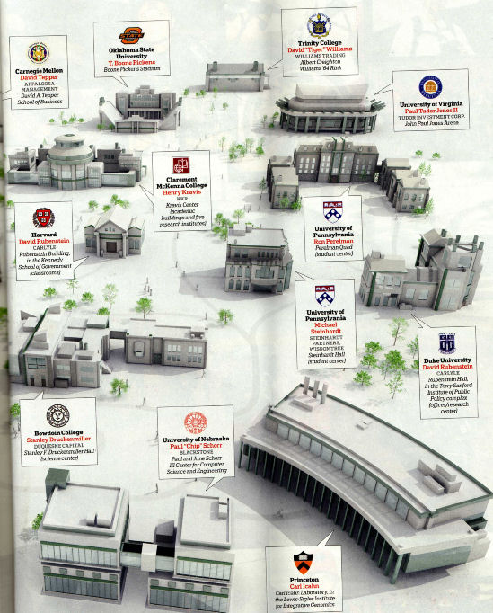 En Estados Unidos existe una larga tradición de donaciones a universidades. Fortune ha dedicado recientemente un número a las empresas que no coticen en bolsa y a los grandes inversores particulares. Uno de los artículos detallaba grandes donaciones realizadas poe estos a universidades.